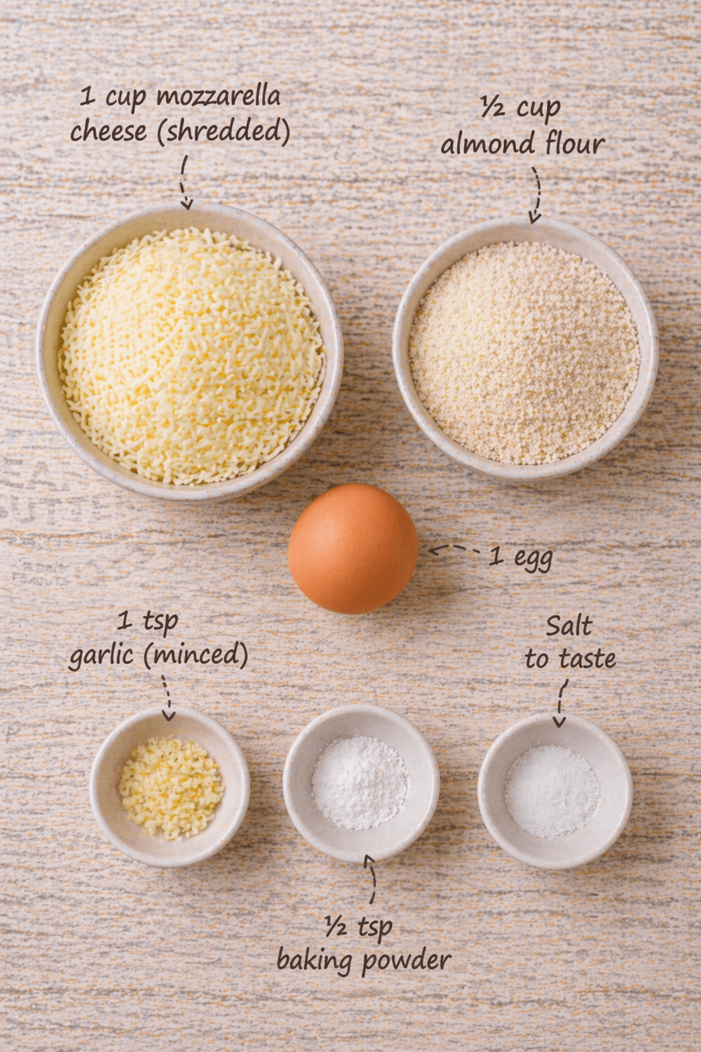 Add almond flour, egg, garlic, baking powder, and salt to melted cheese.