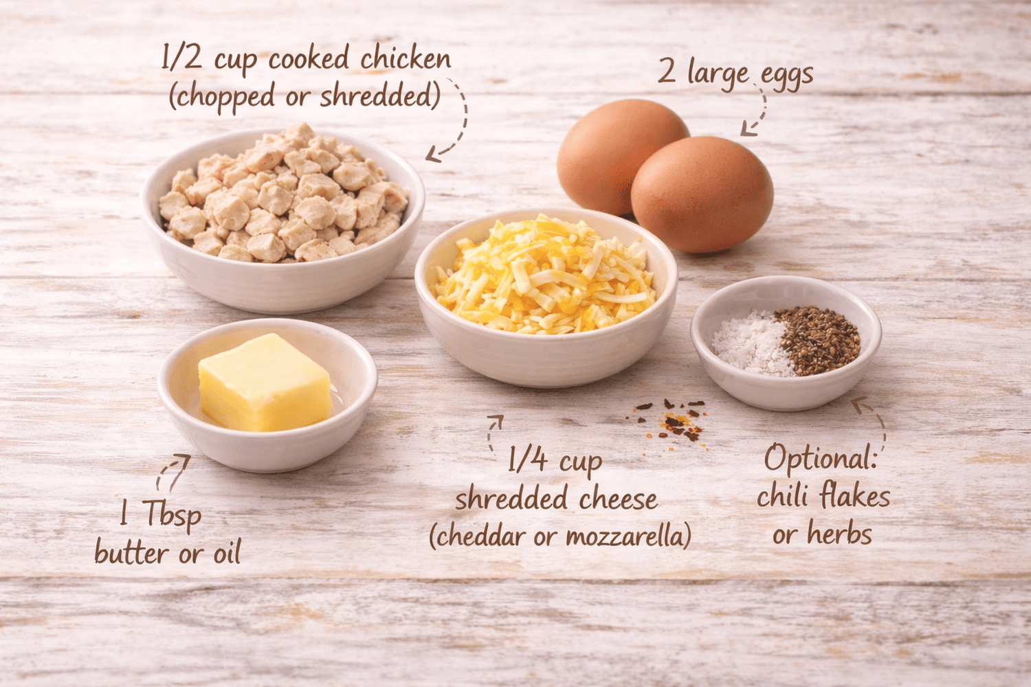 Start by making sure your chicken is already cooked. If not, cook it beforehand and cut it into small bite-sized pieces. Crack the eggs into a bowl and lightly beat them with a pinch of salt and pepper.