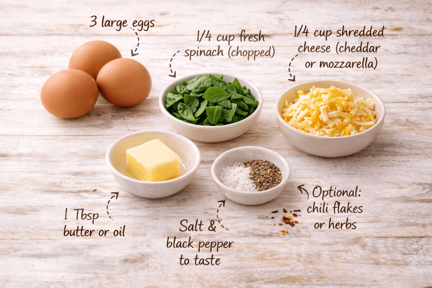 Start by washing the spinach thoroughly and chopping it into small pieces. Crack the eggs into a bowl, add a pinch of salt and pepper, and whisk well until the mixture becomes smooth and slightly frothy.